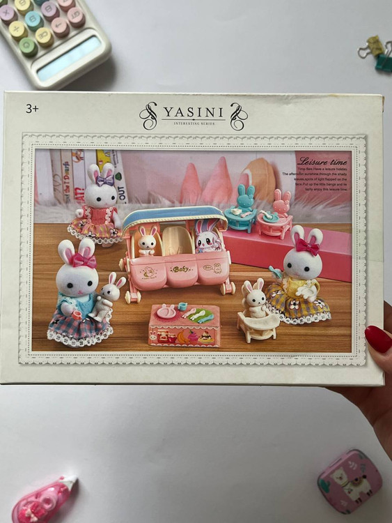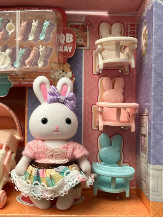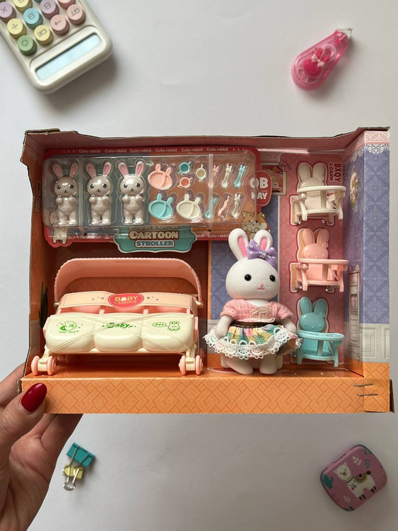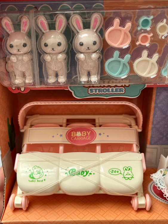 محتویات: هر ست شامل یک عدد عروسک خرگوش/ 3 عدد بچه خرگوش/1 عدد کالسکه/3 عدد صندلی کوچک و قاشق و چنگال های مینیاتوری