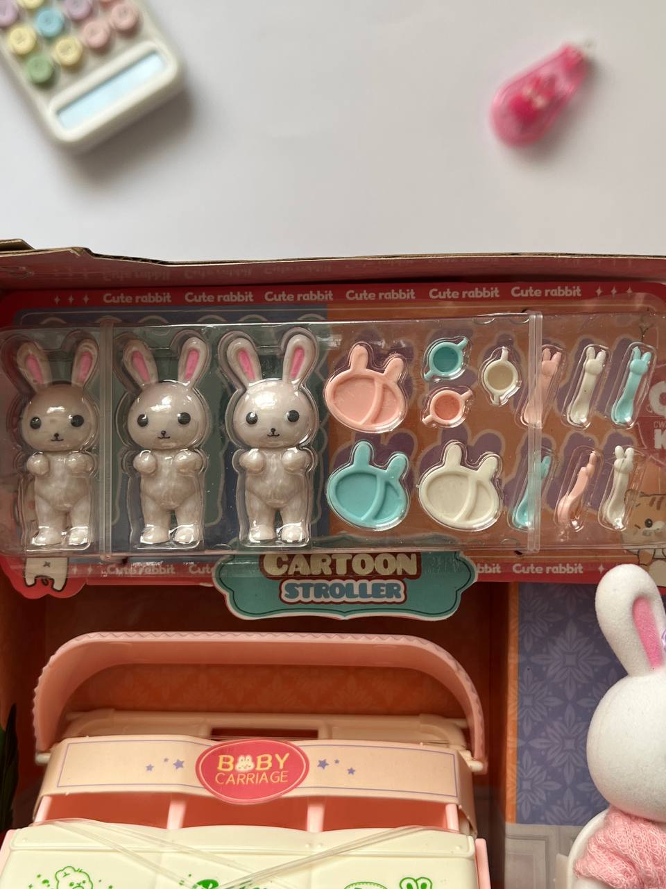 محتویات: هر ست شامل یک عدد عروسک خرگوش/ 3 عدد بچه خرگوش/1 عدد کالسکه/3 عدد صندلی کوچک و قاشق و چنگال های مینیاتوری