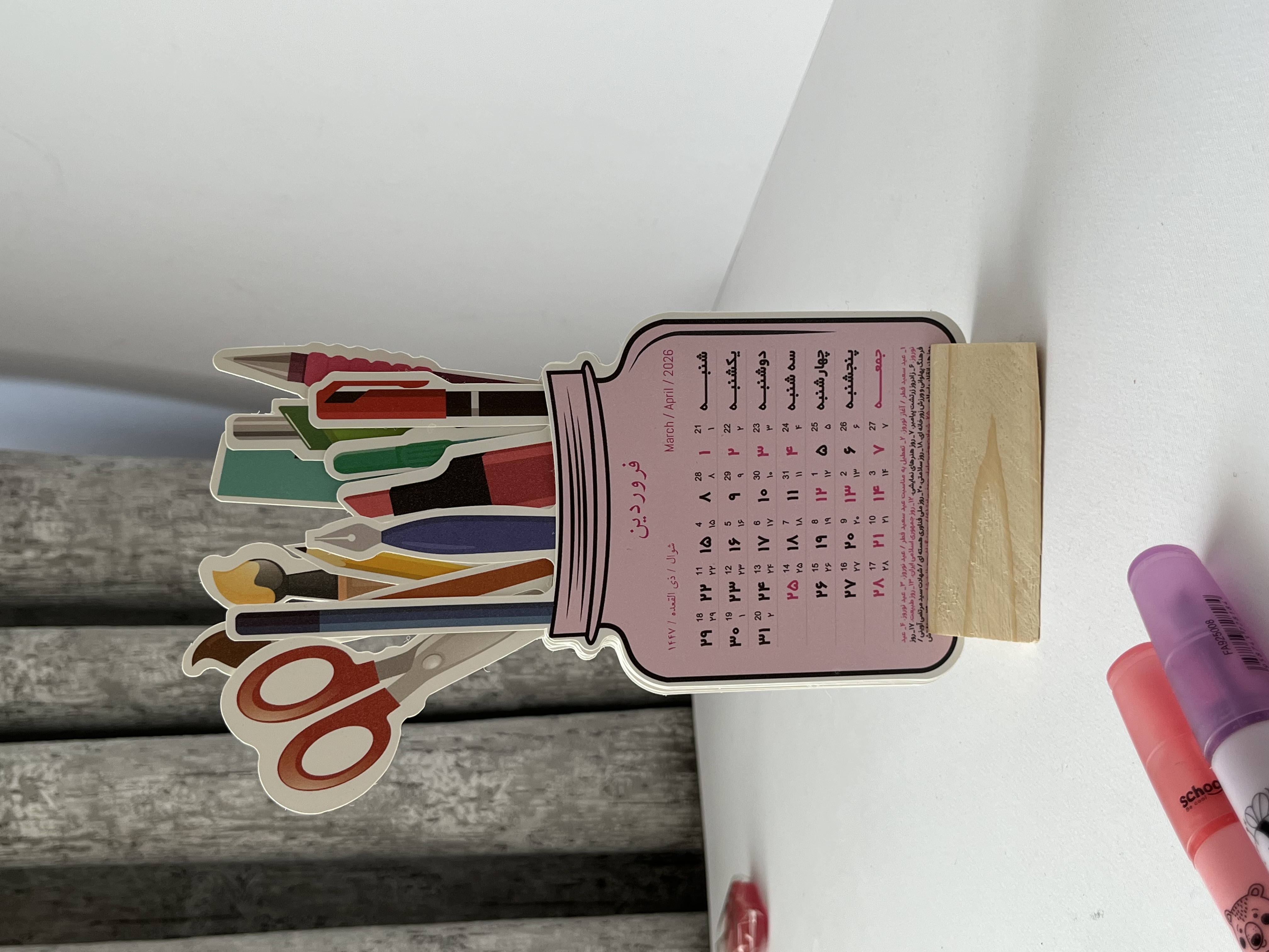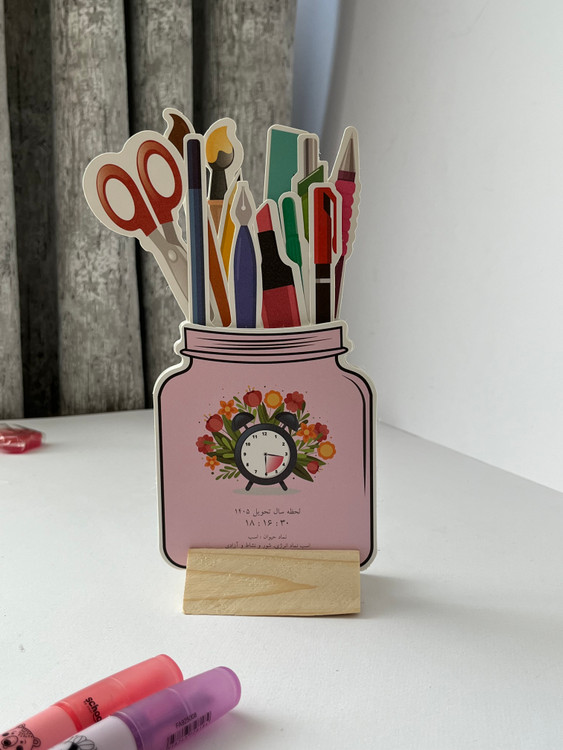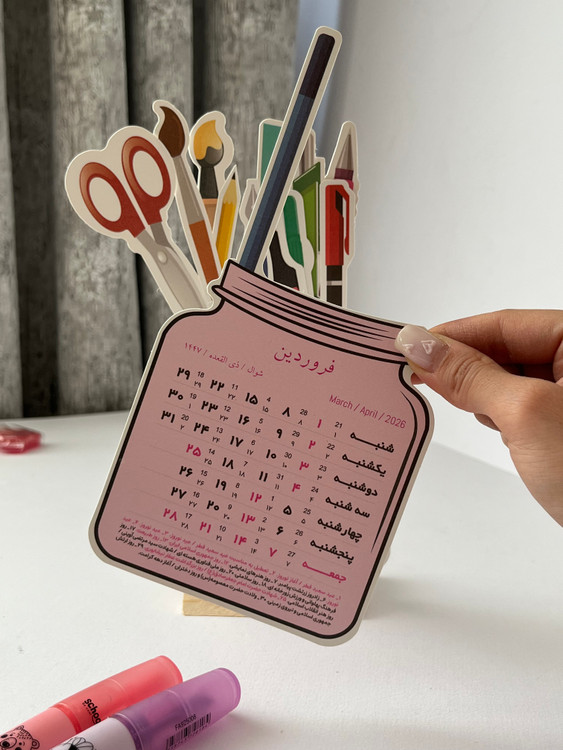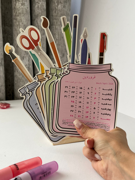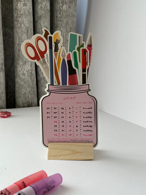 این تقویم رومیزی ۱۴۰۵ با طراحی خلاقانه و متفاوت، انتخابی خاص برای میز کار و میز تحریر است. تقویم دارای پایه چوبی بوده و شامل برگههای ماهانه با طراحی شبیه شیشه است که داخل هر شیشه، تصویر لوازمتحریر مانند خودکار، ماژیک و قیچی دیده میشود.